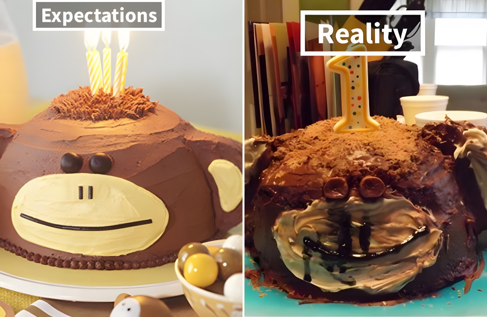 Whenever your cake starts falling apart, frosting is the last attempt to salvage its appearance and make it look presentable. However, in this person’s case, even that didn’t work out. Not only does the cake look untidy, but it also feels like the frosting is dripping all over the place.