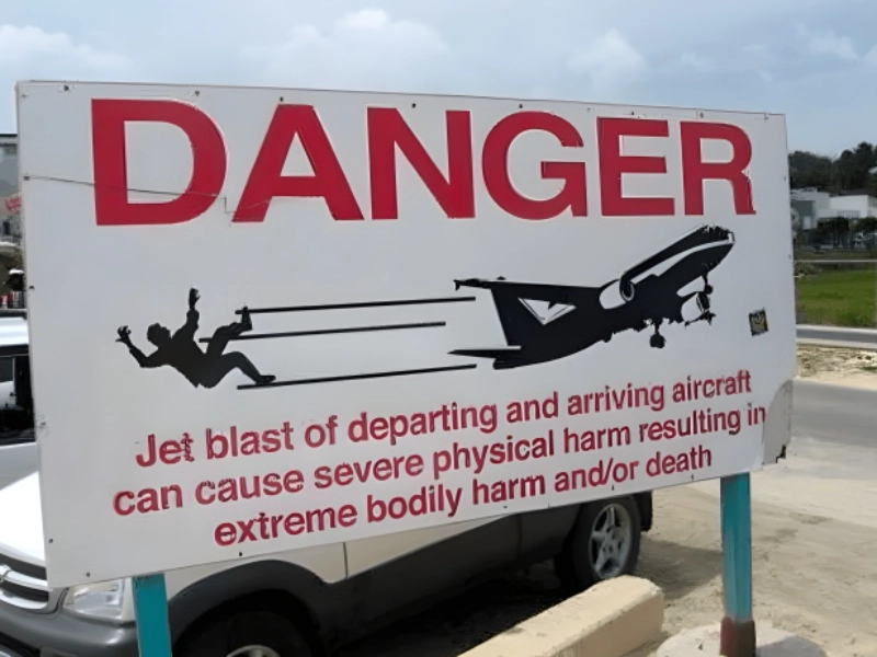 While there are other signs found in airports all around the world, this one is extremely uncommon. This sign, which is located at the Caribbean’s Princess Juliana Airport in St. Maarten, is real in its caution to visitors not to approach the runway because it is too close to the parking lot. This poses a serious risk to public safety and damages the Caribbean region’s image for secure airport operations.