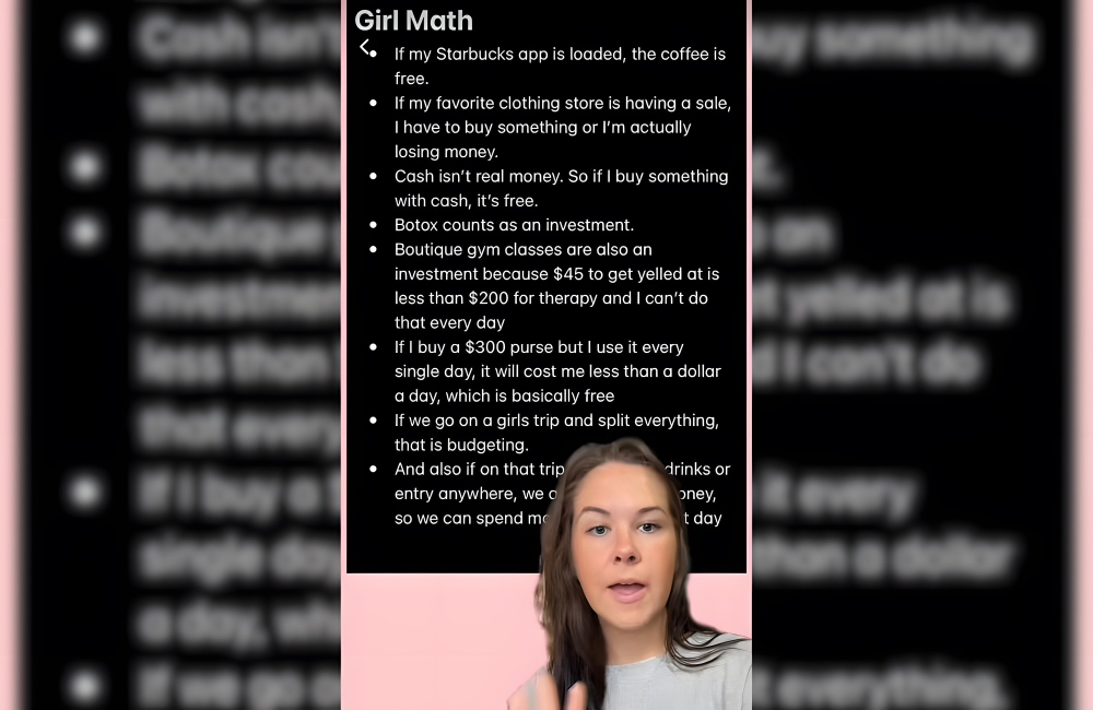 “So, I bought this purse for $38, which means it was $30,” announced a girl mather on TikTok. Her friend added, “Round down, not up. Girl math.” The second example of girl math given had to do with spending at just one store, not multiple stores.