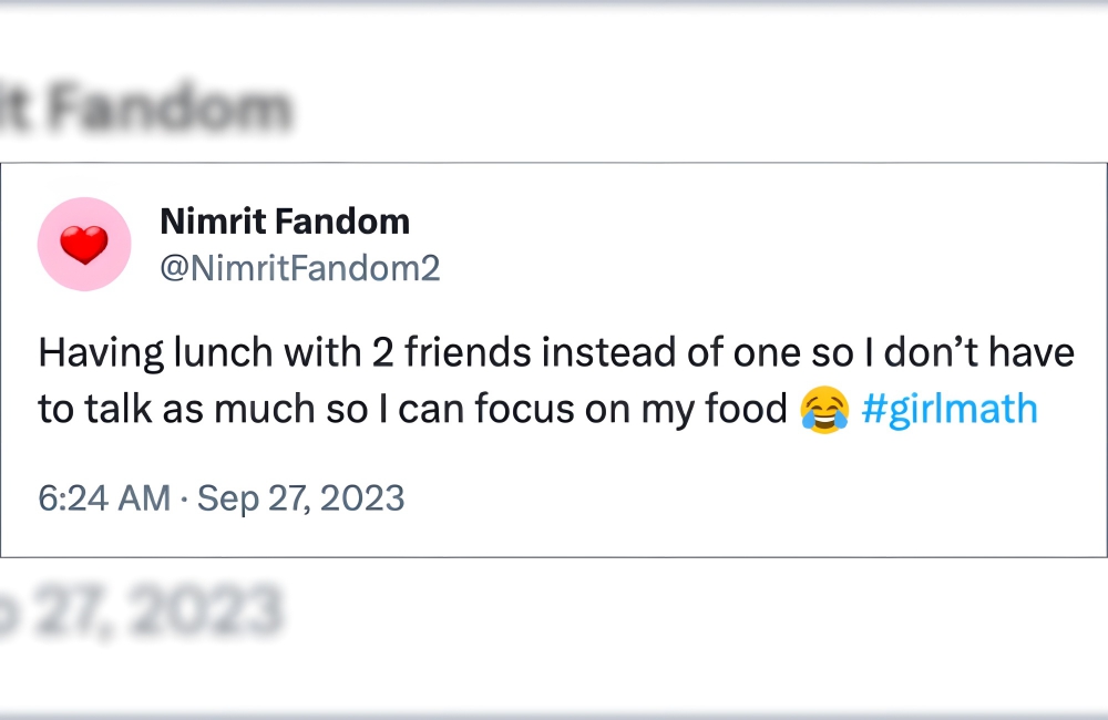 Girl math says you invite two friends instead of one, so the weight of holding the conversation does not rest on your shoulders alone. With three people eating out together, you can conveniently focus on your food without having the conversation die out. Who said girl math was dumb?