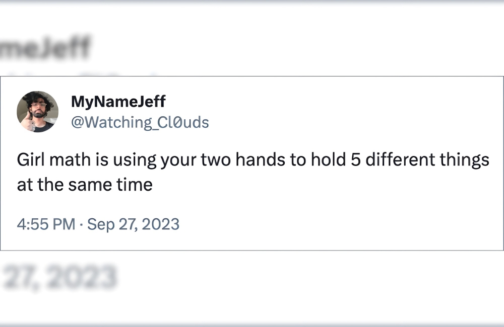Girl math believes that girls have a unique evolutionary trait: the ability to hold five different things in their two hands and still feel like they are holding nothing. This probably stems from the fact that pieces of women’s clothing have not had pockets since the beginning of time, prompting them to hold everything in their hands.