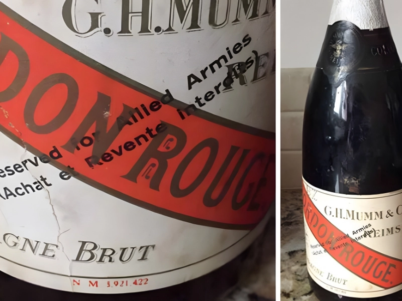 Retrodit/Einkäufe aus Secondhandläden/Champagner aus dem Zweiten Weltkrieg Der Fotograf hat sicherlich ein unbezahlbares Kunstwerk gefunden, das Einzelheiten des Krieges und der Nahrungsversorgung der kämpfenden Truppen beleuchtet. Auf keinen Fall zum Trinken gedacht, sondern eher als Sammlerstück zur sicheren Aufbewahrung!
