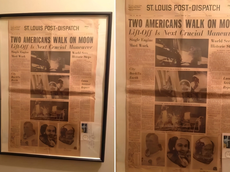 Auf dem Flohmarkt gefunden. Wert: 35 $* Die Person, die dieses Foto geschossen hat, hat tatsächlich einen außergewöhnlichen Zeitungsausschnitt entdeckt. Während er in der Abteilung für gerahmte Fotos auf einem Flohmarkt stöberte, stieß der Fotograf auf diesen vorgerahmten Zeitungsausschnitt in einwandfreier Qualität, der die erste Landung eines Menschen auf dem Mond zeigt.
