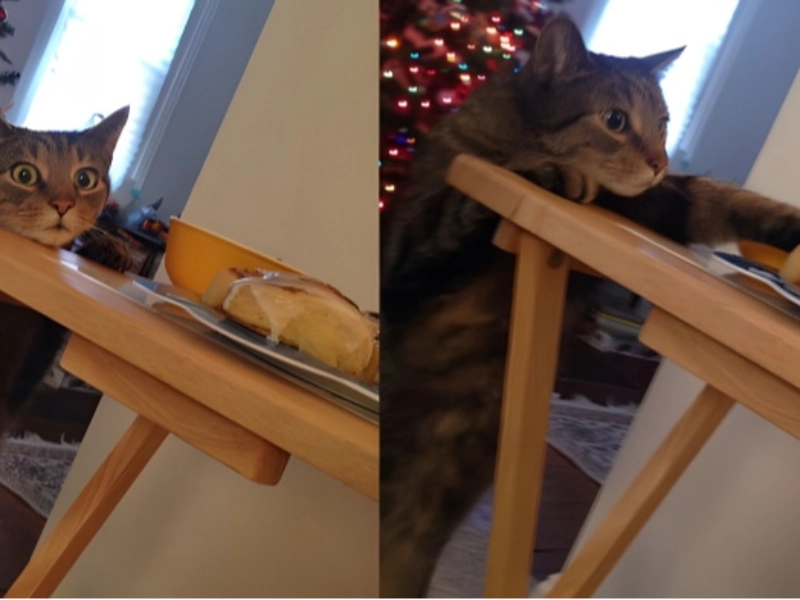 Although cats are well known for their stealth, occasionally their attempts at covert behaviour are everything from subtle. The dichotomy of feline nature is rather amazing: your cat can perform the ideal silent approach to startle you when you least expect it, but when it comes to food theft, their efforts are frequently quite humorous. This specific event centres on a cute kitty whose need for a forbidden treat transcended any kind of stealth. The goal is a seductive cinnamon roll laying peacefully on the kitchen table. The scenario took place in broad daylight and the kitty reached out in what he must have considered to be a deftly subtle action. Captured exactly in the cat’s look, the moment of discovery is priceless; it combines shock, indignation, and maybe some humiliation at being caught in the act. The cat’s expression upon being discovered is one of utter, astonished stillness, as though he really couldn’t understand how everyone seeing his daytime thieving could clearly see. This captures exactly the charming bravado of our kitty companions in response to enticing temptations.