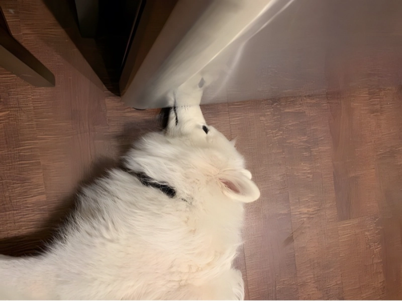Especially with regard to noise levels and overall messiness, living with pets sometimes involves tolerating their eccentricities and sporadic behavioural issues. Although appropriate training can help to solve these problems, many pet owners discover that their dogs seem to have chosen themselves as the unofficial town criers, alerting everyone to such urgent concerns such variations in wind direction or passing leaves. In this specific instance, a noisy pup tried to process his guilt in the most humorous way after being corrected for too aggressive barking. Presumably following the “if I can’t see you, you can’t see me” theory, his selected technique of self-imposed timeout was trying to hide by placing his nose beneath the refrigerator. The fact that his great weight makes this attempt at concealment more useless accentuates the ridiculousness of the circumstances. His big bulk and the small area he is trying to fit into produce a tableau that wonderfully illustrates the adorable logic of our dogs.