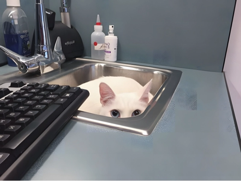 The veterinarian clinic stands for a required but sometimes hated part of good pet ownership. Although we know our dear animals depend on frequent check-ups and medical treatment, convincing them of this need presents a somewhat different difficulty. Like young children seeing a doctor, our animal friends often show amazing ingenuity in their attempts to evade medical attention. This specific cat showed their opposition to veterinary treatment in a wonderfully failed yet very funny way. The cat chose what they apparently thought to be a clever hiding place in the sink of the examination room instead of trying a bold escape from the clinic. Sadly for our feline companion, the glaring white porcelain sink turned out to be maybe one of the least efficient hiding places imaginable, resulting in a scene that aptly captures the often illogical but always interesting character of cat behaviour. This already funny scenario gains further comedy from the contrast between the cat’s deliberate attempt at concealment and the clear sight of their selected position.