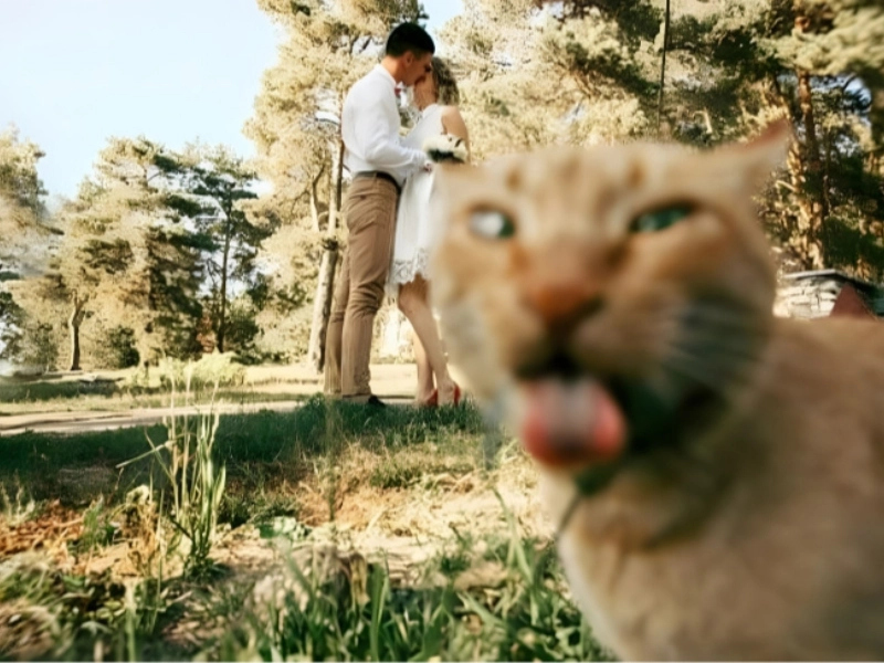 Having romantic pictures taken with your boyfriend and then being photobombed by a cat is nothing like this. This cat seems to have wandered into the frame to purposefully destroy the picture by sticking his tongue out. He most certainly wanted a little attention, of course, but any way, the picture is very humorous. He’s even somewhat blurry, which would fit the face he’s creating.