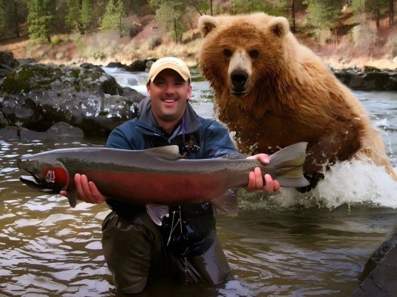 We find great delight in this picture. With his large haul, we see a content and proud-looking fisherman; behind him, we notice a friendly bear. Alright, okay, the bear isn’t looking very nice at all; this picture could have been taken just before a calamity started. But as you know, We’ll just pretend as though that bear wanted to attend the picture op; what we don’t know won’t harm us.
