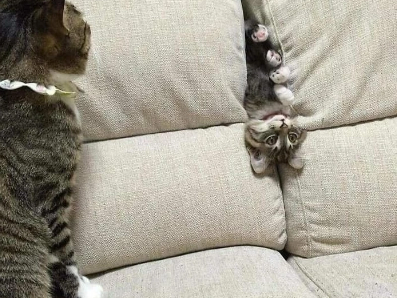 Absent bias. Everybody finds comfort in a different way, and it appears that this cat has a particularly special method of doing so. Rather than curled up on the couch or perching on top of it like some cats do, the cat chose to nuzzle in between the sofa cushions. Not only did they snooze in, but they also snoozed inverted and lounged there.