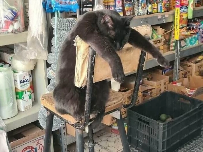 Perhaps all cats actually like doing is scaring people. Rather than trying to blend in and be like all the other species, they choose to make people happy by acting in ways like this. The cat of this person enjoys taking naps at the small market near their home. They prefer to nap in an unusual position while sitting on the chair, so it’s not just any old nap.