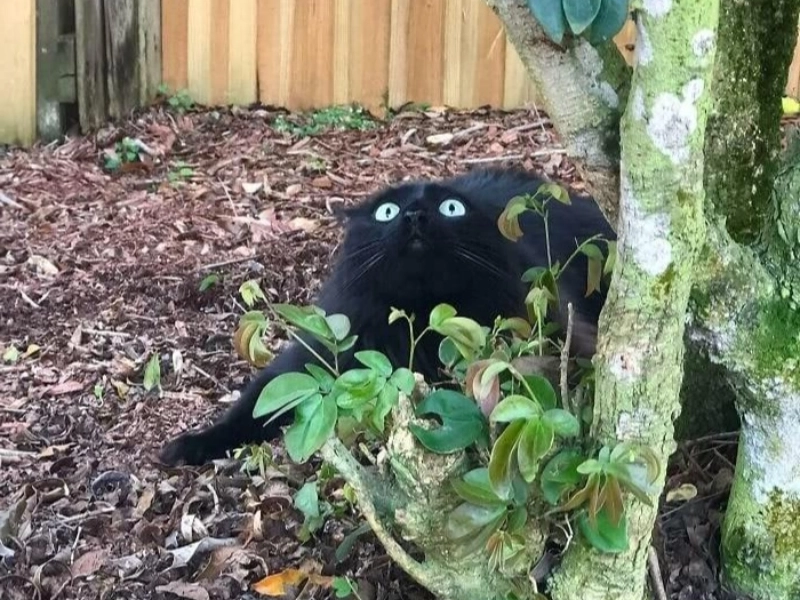 Aside from the enthusiasm, this cat has quite striking eye colour. It creates a striking photo and blends in perfectly with the surrounding flora.