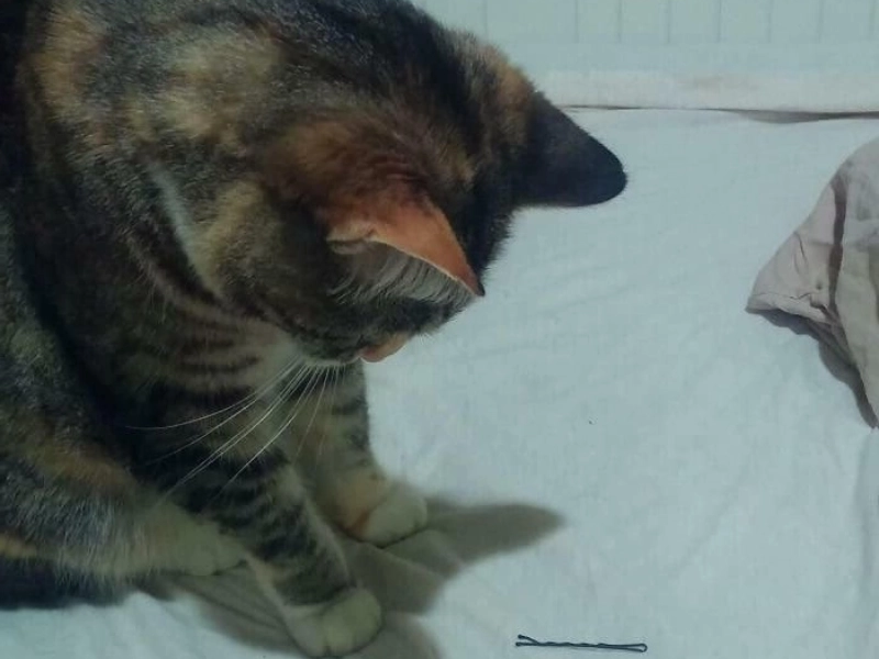 Some cats are fascinated by novel objects in their homes and spaces, whereas other cats find them confusing. The owner of this cat seemed to have been accustomed to living alone since she was unmarried for an extended period of time. But when he found a girlfriend, she left a bobby pin behind in the home. The cat, to put it mildly, was not impressed.