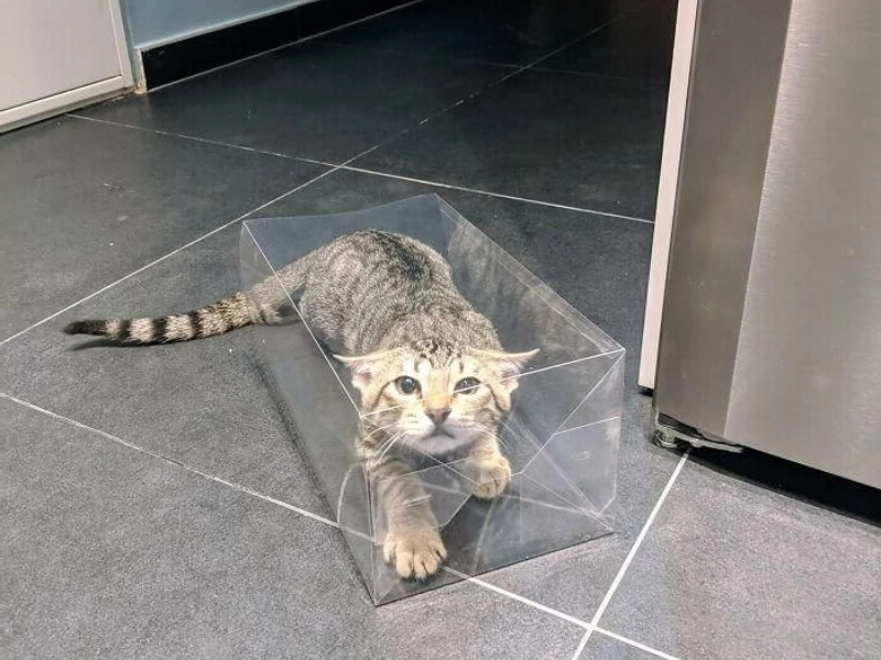 The fact that this gorgeous cat, who was saved from a construction site, like see-through boxes adds to the irony and cuteness of her box infatuation.