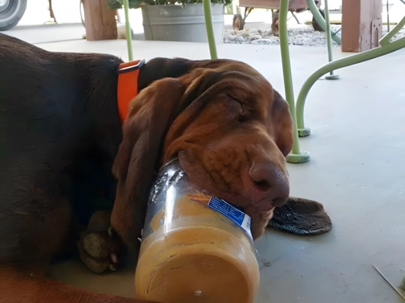 We’re not sure if this dog would have eaten so much peanut butter he would have fell asleep or if he was so content he couldn’t help but close his eyes and savor the moment. All the same, he is content.