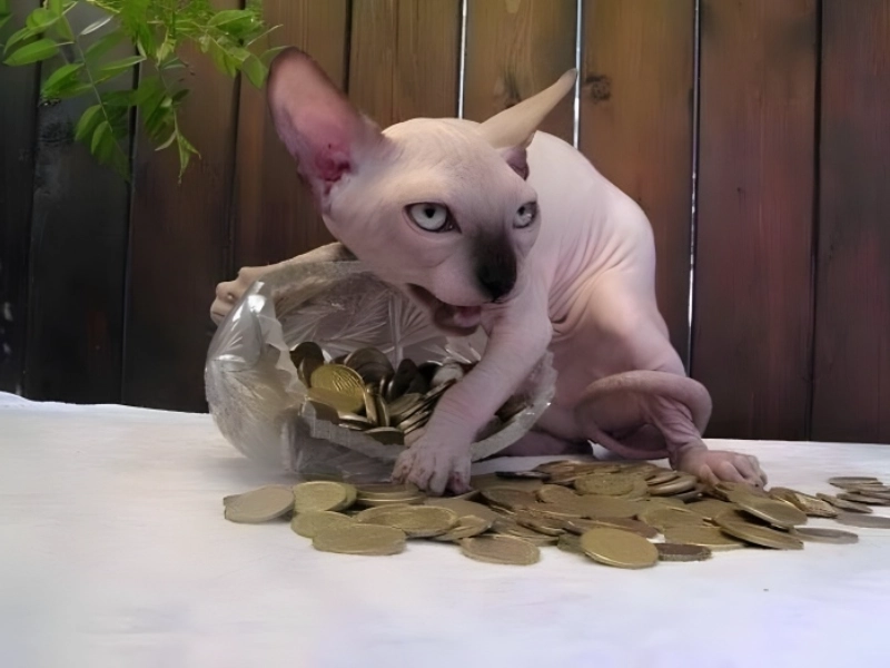 The sight before us resembles something out of a strange heist film in which the mastermind turns out to be a sphinx cat with an odd fascination in money. The fierce stare of the hairless cat paired with its defensive posture over the currency pile produces an interesting but funny picture. Its wrinkled face and absence of fur simply accentuate the dramatic impact and give it the impression of an old protector of lost treasure. The overall arrangement begs a lot of issues. Has this cat methodically been gathering these coins? From what source did they come? Is this sort of feline savings account? The cat’s attitude implies that, should it be needed, it is ready to defend its financial treasure using all nine lives. It reminds us that regardless of their looks, cats never stop surprising us with their unique actions and apparent grasp of human ideas—in this case, the worth of money.