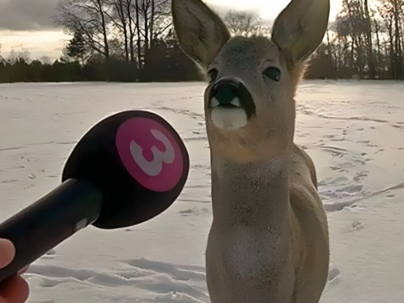 The picture catches one of those well timed events that provide local news such entertainment value. The deer’s wide-eyed look and the reporter’s austere manner as if doing a proper interview provide an absolutely remarkable scene. It’s even greater as this results from a touching tale of improbable animal friendship. The deer’s look suggests, “I never expected to be on the evening news when I decided to befriend that dog!” The way the photo is composed, with the deer seeming to be a real interview subject, shows why context is so important. Still, occasionally the lack of background makes things far more interesting. While simultaneously providing a poignant tale about cross-species friendship, this specific news item most likely made viewers laugh. This kind of local news material makes you happy and helps you to regain faith in both nature and journalism.