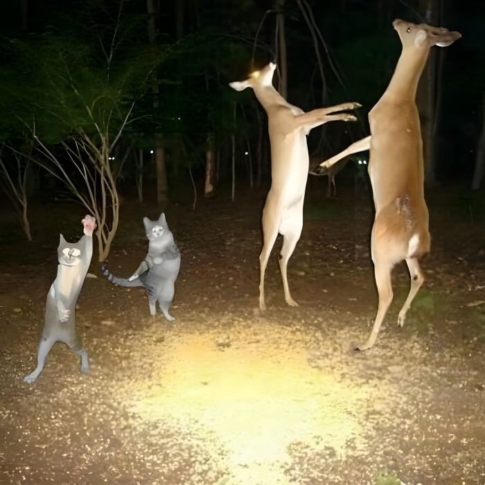 Looking at this enigmatic evening photo increases the more fascinating details show themselves. While the animal placement suggests some sort of organised meeting, the reflection of several pairs of eyes produces nearly disco ball look. It seems as though we have discovered a secret woods nightclub where the local fauna lets loose following human bed-time. On this natural dance floor, the deer seem to be the major performers; the cats could be the bouncers maintaining discipline at this private woodland event. The rational answer is that ordinary nocturnal animal behaviour around a food source explains things; nonetheless, the imagination runs wild with the prospect of a secret animal kingdom nightlife we never knew existed.