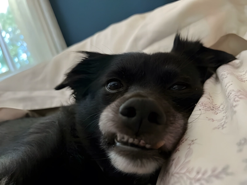 Apparently, this dog has her own bed; dog owners fall into either one of two categories: those that love snuggling with their pet at night and those with a strict ‘no dogs on the bed policy.’ Still, the original poster woke up to exactly this vision. The eyes were beautiful, full of affection, and puppy-like. Still, there is reason for worry concerning the teeth! Still, we’re rather convinced this fuzzy pal wanted to greet her owner a nice morning!
