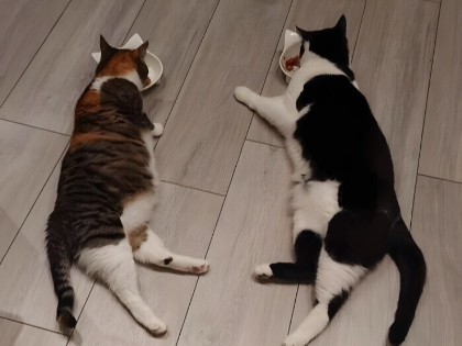 The unusual feeding posture these two cats have chosen adds even more interest to this particular setting. The background of their coordinated eating behaviour gives the scenario still another level of appeal. The family never expected their pet cat to grow to be such a major player in their home dynamics. Though it might seem lethargic to human viewers, the newcomer’s unusual eating posture actually shows how remarkably flexible and impactful cats are in influencing one another.