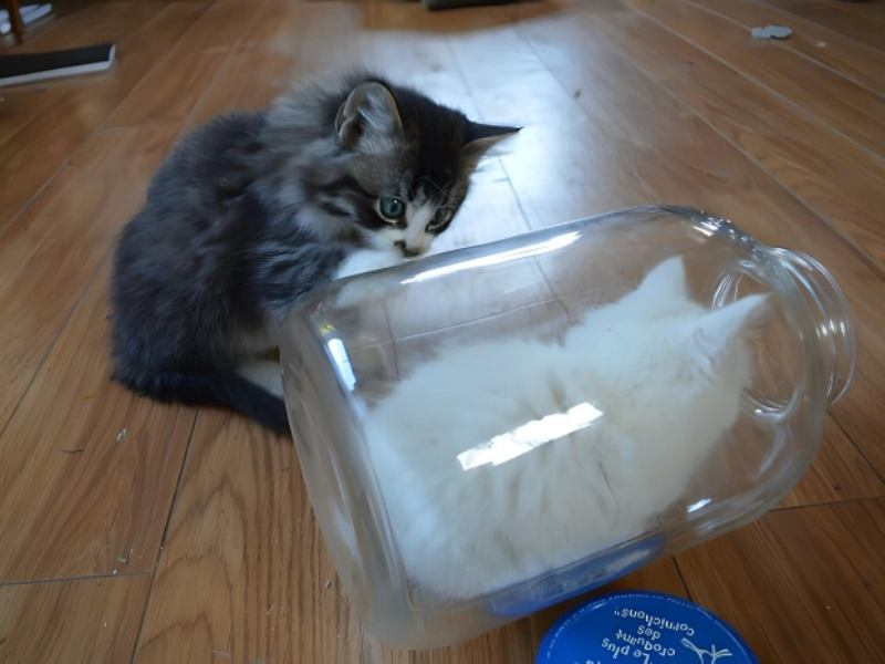 The white kitten’s apparent contentment with their translucent “hiding place” contrasted with their brother’s perplexed look provides a humorous scenario that aptly portrays the core of feline logic, or lack thereof. Though scarcely a useful hiding place, the glass jar has become this kitten’s preferred refuge since it shows how inexplicably drawn cats are to all kinds of containers, independent of their usefulness.
