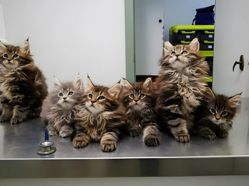 We can most certainly understand why the veterinarian stopped momentarily to capture this scene. One must see it to believe it! One of the oldest natural breeds in North America, renowned for being gentle giants in the cat world, this animal veterinarian enjoyed providing a routine check-up to these nine-week-old Maine Coon kittens. We wonder how the veterinarian maintained their captivation.