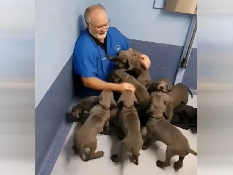 This vet seemed to have been overwhelmed by this huge litter of Great Dane puppies, which looks to have caused him to be cornered in the clinic! Even if these dogs aren’t precisely a scary pack, their enthusiasm must have been pretty challenging. Based on the vet’s expression, he seems really content with the way the visit is going though. This has must made today at work unforgettable.