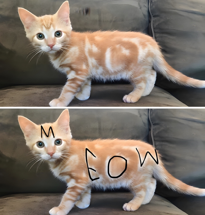 This is defintely one that took a little imagination on the pet owner’s part. You’d truly have to be a cat lover in order to spot this. They noticed that their cat had an odd-looking pattern and after staring at it for what we imagine was a good while, they made out the word “meow.” It’s much easier to see after having looked at the photo with the markup.