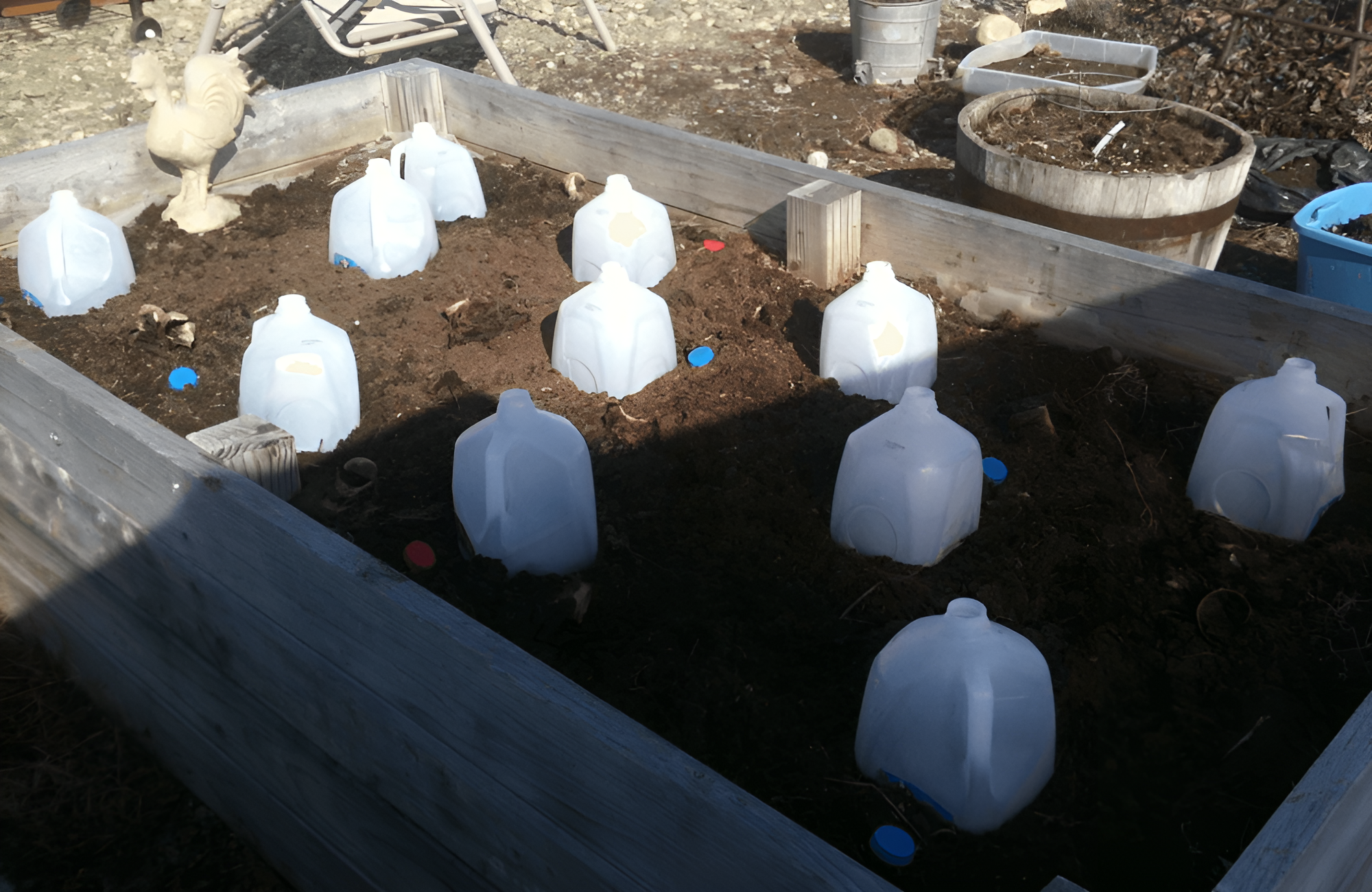 Materials Needed: Clean, empty gallon jugs, a box cutter knife, a drill, seeds and seed starter, a five-gallon bucket, small shovel, water, permanent marker, duct tape