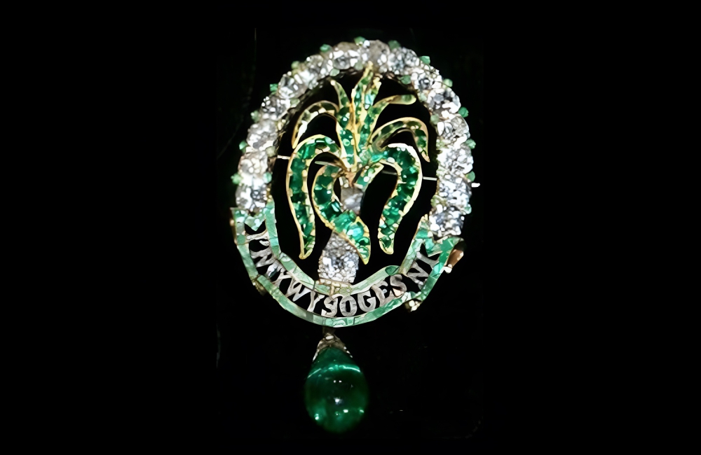 The Ladies of North Wales Leek Brooch has been worn by a few Royal family members, including the Duchess of Cornwall. The Brooch is made from diamonds and emeralds, with the slogan, “To Our Own Princess” inscribed in Welsh. Originally, this brooch was the property of the early 1900s ruler, Queen Alexandra.