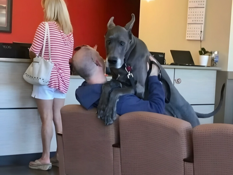Given his appearance, this dog and his owner most likely are waiting for the vet. Dogs truly find nothing more terrifying than a visit to the veterinarian. When a typically courageous and protective friend becomes a terrified bundle of fur looking for comfort, the scenario brilliantly depicts that universal moment of weakness that all pet owners know. These gentle giants, despite their great weight and power, often have the most sensitive souls; this reminds us that bravery is about confronting your worries with someone you trust at hand, not about never being frightened. Seeking solace in his owner’s hug, this massive dog’s attempt to make himself as small as possible reveals a great deal about the close emotional ties we have with our dogs. Seeing such a big dog trying to be a lap dog in times of fear makes one laugh especially as it seems as though they have long outlived their days of easily fitting in their owner’s arms.