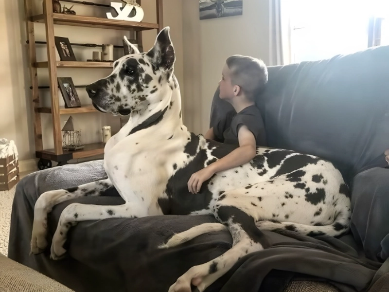 Still, one thing bothers us about this picture: the way the dog and the child are facing. Clearly, their points of view are different. And what are they staring at? Maybe they are following the age-old custom of multi-screen entertainment: the lad concentrated on his preferred show while the dog kept a wary eye on the window, observing the local squirrel situation. This open moment perfectly embodies modern friendship, in which comfort meets technology and size variations are meaningless in the search of common enjoyment. The fact that the dog seems to occupy most of the couch area makes the image even more charming, yet the youngster looks quite happy with his little corner, which is evidence of the gladly made concessions for our four-legged family members. These calm times of bonding—where a small child and a large dog discover ideal harmony in their shared environment—generate lifetime of memories.