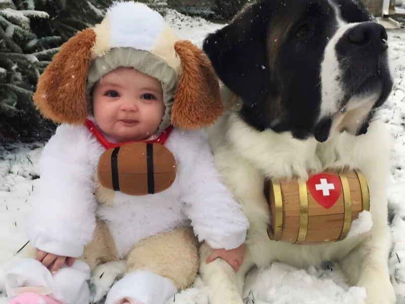 The photograph catches one of those ideal moments that makes family photo books quite unique: the contrast between the small, bundled-up newborn and their enormous furry protector produces an adorable and funny picture. The scene gains even more charm from the winter environment since the immaculate snow offers the ideal backdrop for this unusual team. The apparent care and tenderness the big dog displays for their small human friend makes this image really unique. Though their outward differences are great, there is an obvious bond of love and trust that cuts across all kinds. While the protective posture of the canine friend shows the amazing capacity these enormous breeds have for being careful and sensitive with smaller, more vulnerable family members, the baby’s ease around such a big animal tells volumes about the dog’s loving nature. A lifetime of animal admiration and respect typically starts with this kind of interaction between babies and their family dogs.