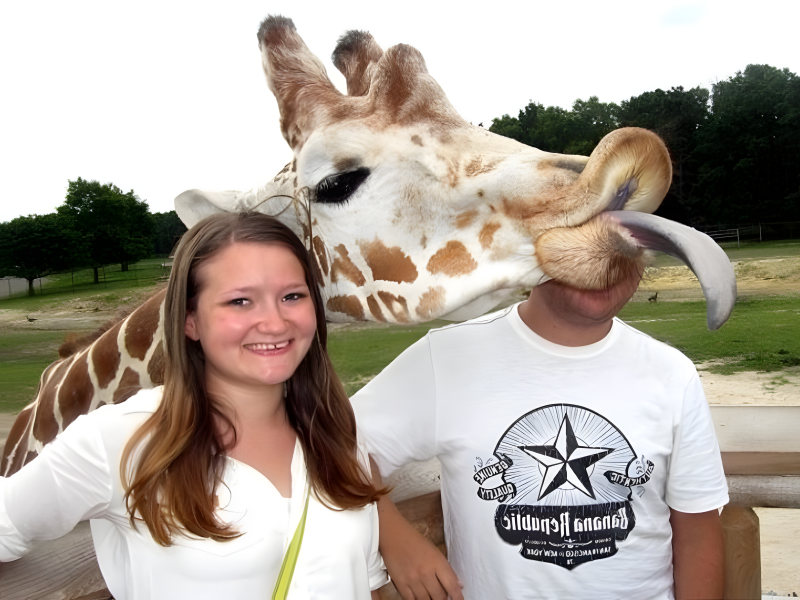 The giraffe requested a picture. Six Flags Adventure Land is an American theme park.