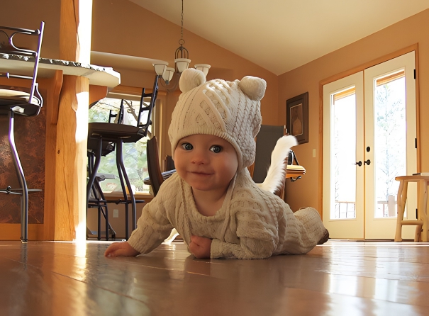 Well, human evolution has gone quite far. And suddenly, one day, the baby got a tail! A cute infant suddenly appears a little more feline, thanks to a photobombing furry feline. The baby must be thinking, “Now I’m a half-human and a half-cat.” Though this is the cutest picture that got captured at an excellent time, there is nothing creepy about it. The baby must be one in 100,000 who’s born with a tail. Well, the tail has made the baby look even better and cuter.