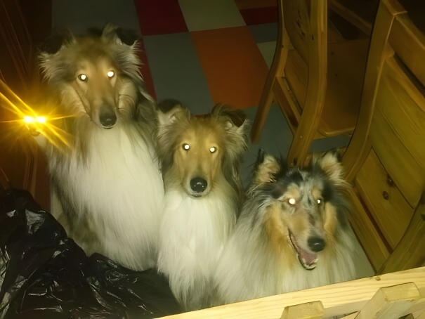 Here’s a rare sight of a cat who’s hanging out well with the dogs. However, it actually took us a while to see the cat. We thought that was a reflection! Cats and their laser eyes always make a deadly combination. Whenever the laser power is on, we can’t make the mistake of ignoring them. It looks like this picture was her debut. The dogs are trying to look evil, but the cat is the real devil.