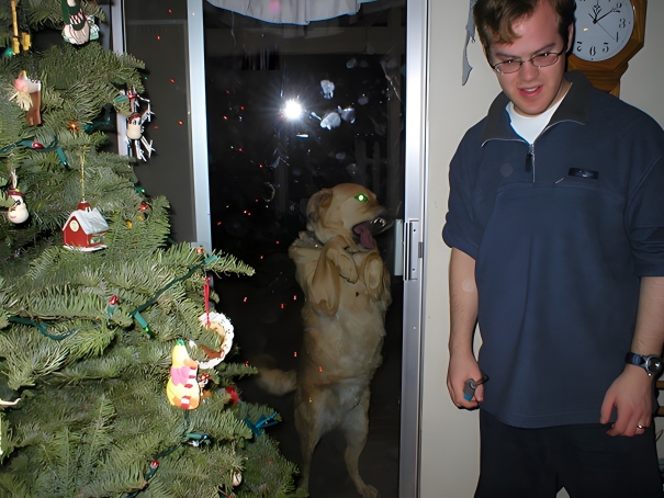 At the very first glance, the picture looks terrifying. Ever seen a Christmas picture that looks haunted as if the dog is possessed. The guy’s Christmas can turn into a deathbed, so he shouldn’t open that door. Who knows, maybe the dog has been infected with some kind of virus, just like in the movie Resident Evil. It looks like a zombie dog locked behind the door and trying hard to come inside. From his furious eyes, it’s evident that he’s going to kill everyone right away once he’s in.