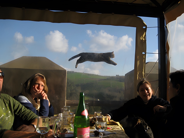Fly like an eagle and see no evil. Well, is it a bird? Is it a plane? Actually, it’s a Super Cat. He might be a fan of Superman or Catwoman. But where is the cape? The cat is probably going out to save other cats from being bullied by dogs. It looks like a family meal got interrupted by a spectacular Super Cat who’s on the move. Maybe cats have evolved to the point that they can fly away from humans whenever it is not the feeding time.