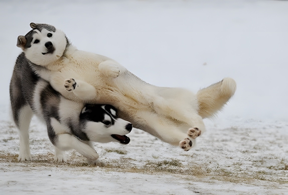 This looks like a dog version of the Korean show Crash Landing On You. Introducing two cute Siberians named Treason and Husky, who love to play around. Their favorite hobby is eating good food, and their favorite time pass is rolling into each other all day. This is their one in a million shot. The dog on the top looks innocent and strangely okay with whatever is happening with him. He must be thinking, “This seems like a good spot to lay down,” or maybe he thinks now he can fly.