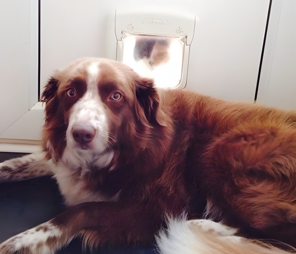 Is the cat singing the song in her head, “Hello darkness my old friend,” or plotting a scheme to get rid of the dog?