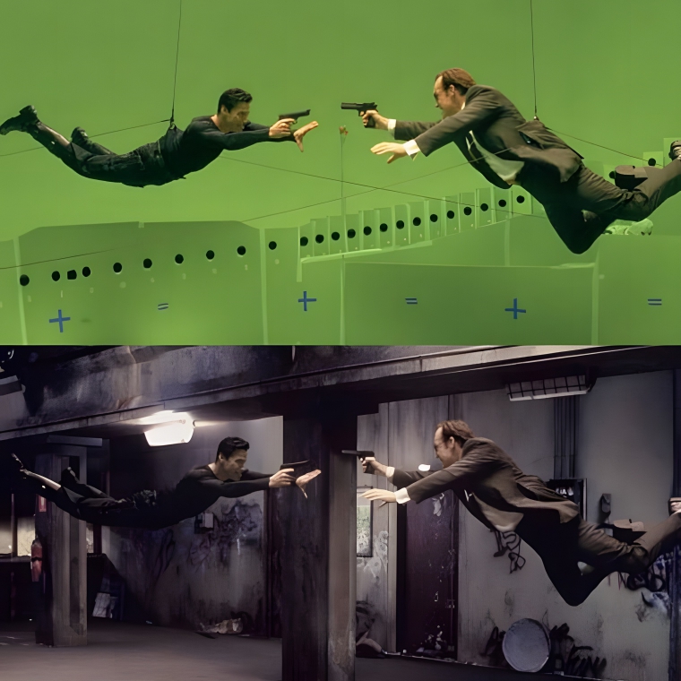 Back to showcasing The Matrix movie again, the above scene was set up in a storehouse and green screen was still deployed in the entire background. Taking into account that half of this movie plot revolves around the character “Neo” doing his thing while inside The Matrix, a great deal of CGI needed to be used.