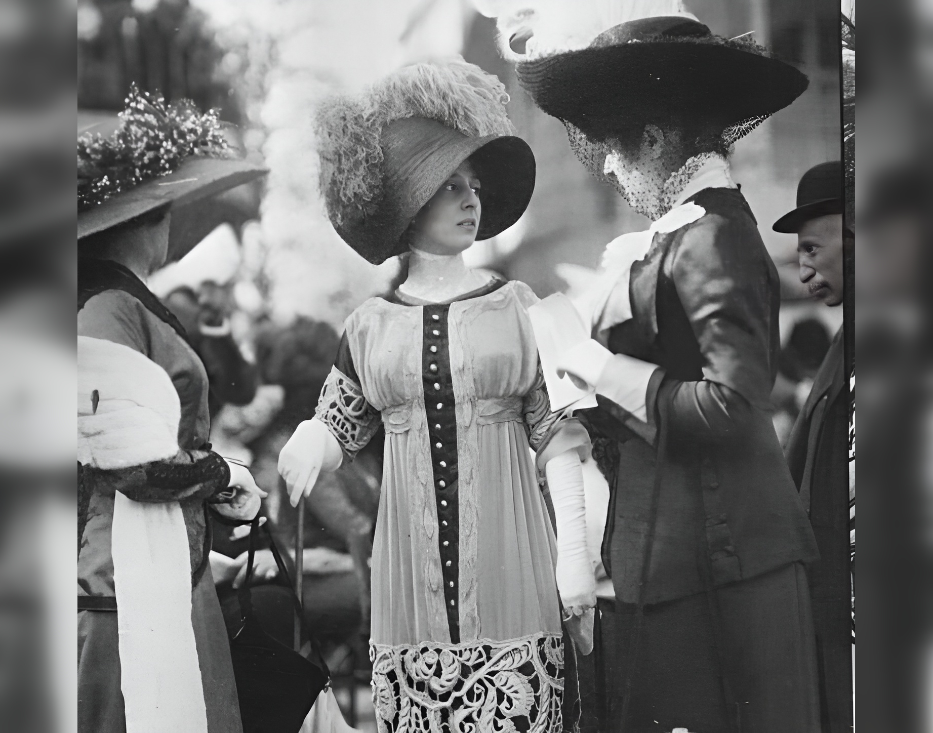 In the photo, you can see the famous early 20th-century designer Paul Poiret with his models. Poiret freed European ladies’ dresses from petticoats and corsets, creating light everyday outfits. Now, European women could dress themselves without the help of a maid.
