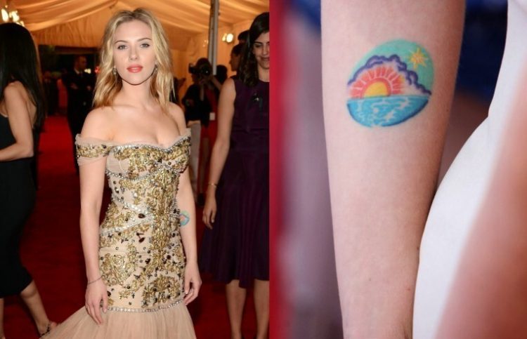 Scarlett Johansson has several tattoos on her ribs, forearms, ankles, and wrists, including a colorful tattoo of a sunrise on her left hand.