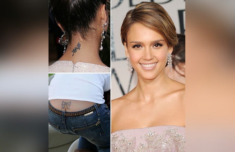 Jessica Alba has several tattoos, including a neck tattoo, a wrist tattoo, and a seductive bow tattoo on her lower back.