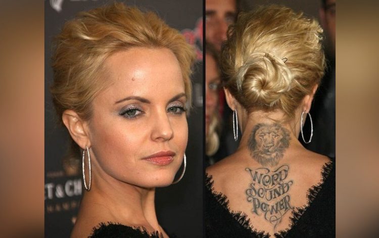 Actress Mena Suvari has a lion’s head tattooed on her back with the words “Word Sound Power” underneath.