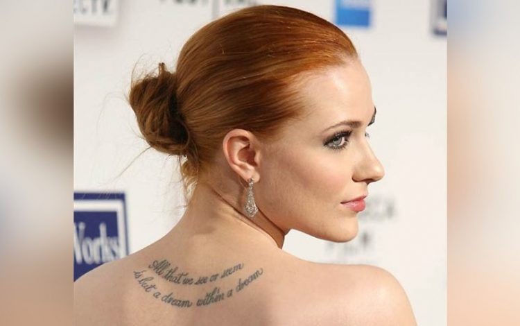 Actress Evan Rachel Wood has a quote from Edgar Allan Poe’s “Is all that we see or seem, but a dream within a dream?” tattooed on her back. She has nine tattoos in total, one of which is a secret and located on the inside of her lip.