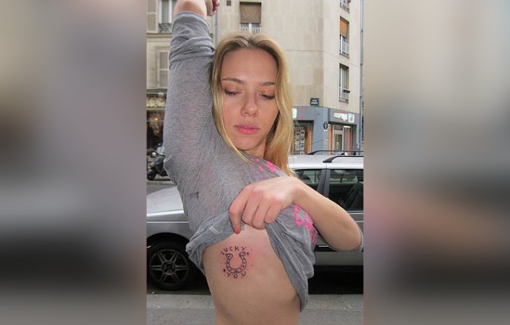 Scarlett Johansson has a horseshoe and the inscription “Lucky You” tattooed on the side of her chest.