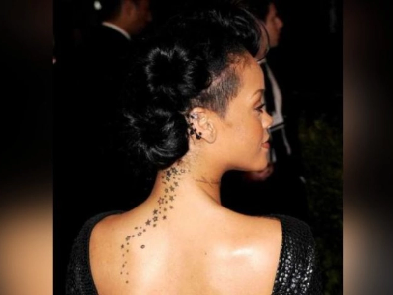 One of the singer’s tattoos is a lovely arrangement of stars that extends from her neck to her back. On Rihanna’s right leg is a tiny music key and note that are hidden.