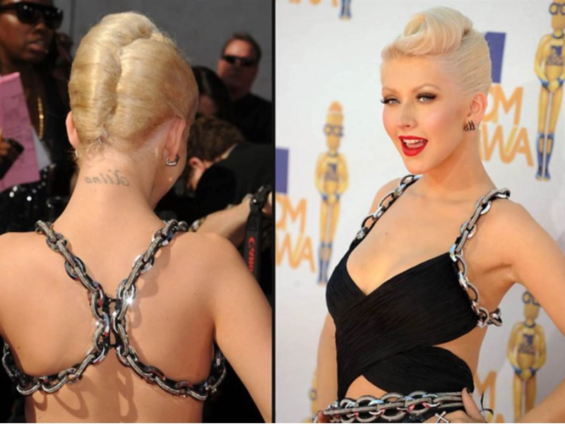 The singer’s nickname, Xtina, is visible under the delicate neckline of the vocalist. Aguilera is covered in five tattoos in all.