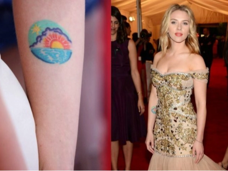 Scarlett Johansson has multiple tattoos on her wrists, ankles, ribs, and forearms. Her left hand has a vibrant tattoo of a dawn.