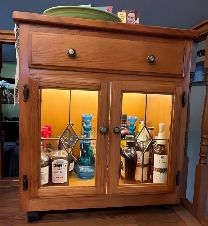 They ought this little oak cabinet for just $3 in a thrift store, and then spent a little bit of money on upcycling it. They replaced the hardware, stained it, and added some LED strips to make something that looks very expensive!